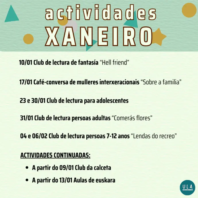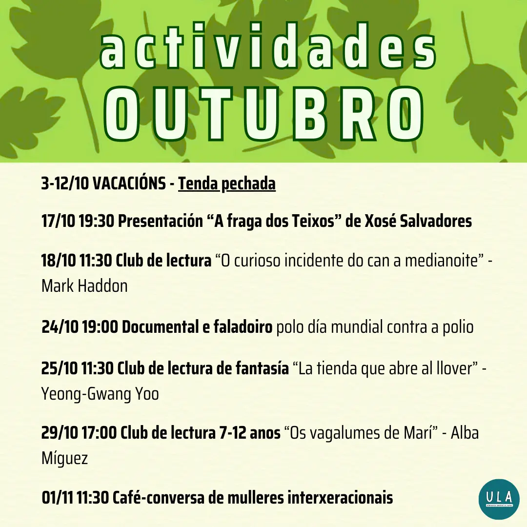 Nesta páxina atoparás as novidades de lectura e as diferentes actividades que levamos a cabo na ULA Libraría Social, pero se queres saber un pouquiño sobre o proxecto, podes acceder ao apartado O proxecto.